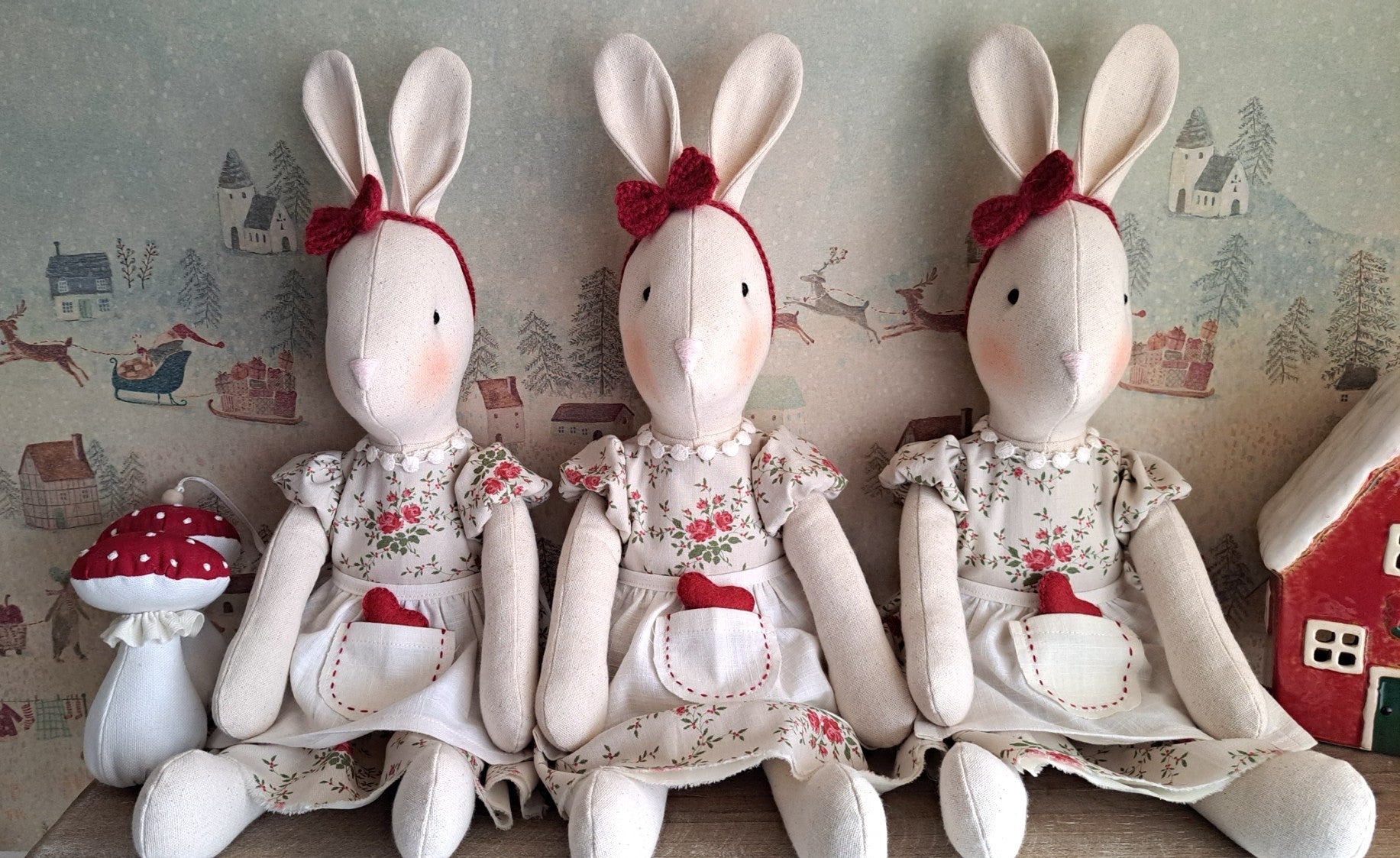 Valentine’s Veronica Bunny is a timeless handmade heirloom, lovingly created to be cherished for years to come. Crafted from natural linen, she wears a beautiful Tilda vintage rose cotton dress, featuring tiny red rose sprigs and olive green foliage, with delicate puff sleeves and a cotton crochet trim at the neckline. Her outfit is finished with a softly gathered linen apron tied at the waist.
