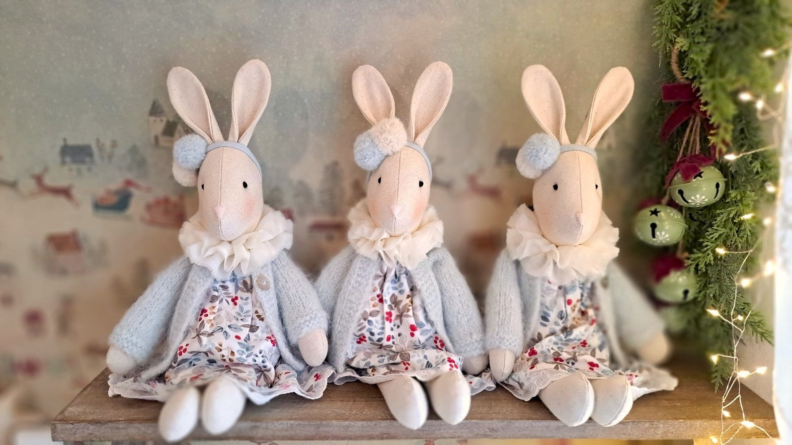 Meet Veronica Bunny, a timeless keepsake inspired by winter’s quiet magic and the gentle spirit of the woodland. Dressed in a soft cotton dress scattered with winter berries and leaves, she captures the charm of a traditional handmade Christmas.
